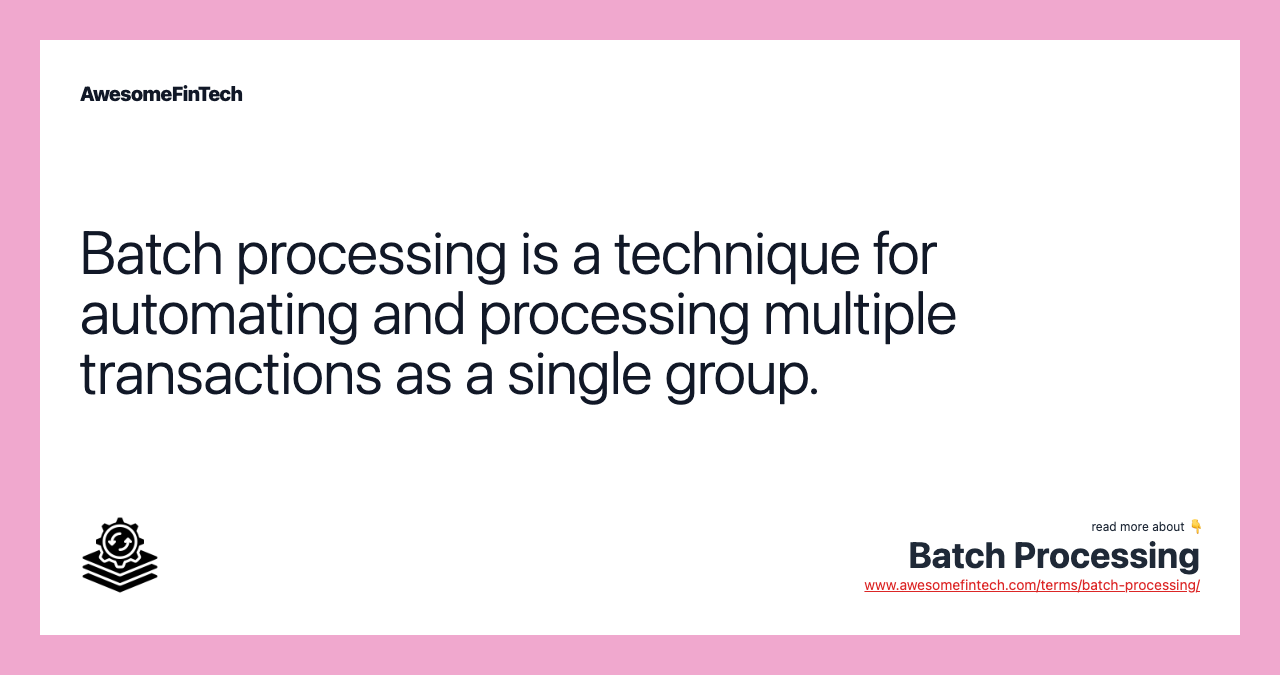 Table of Contents What Is Batch Processing? While batch processing can be carried out at any time, it's particularly suited to end-of-cycle processing, such as for processing a bank's reports at the end of a day or generating monthly or biweekly payrolls. Batch processing is a technique for automating and processing multiple transactions as a single group. This differentiates batch processing from transaction processing, which involves processing transactions one at a time and requires user interaction. Advantages of Batch Processing Batch processing is the processing of transactions in a group or batch. Because batch processing involves handling large amounts of data at once, if the inputs are off in any way the whole batch will be flawed, wasting time and money.