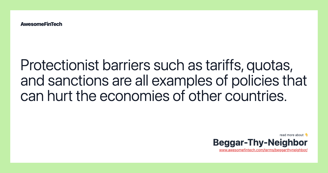 Beggar-thy-neighbor often refers to international trade policy that benefits the country that enacted it, while harming its neighbors or trade partners. Protectionism is often seen as a key example of policies that are intended to strengthen a domestic economy, but which may negatively impact trading partners.