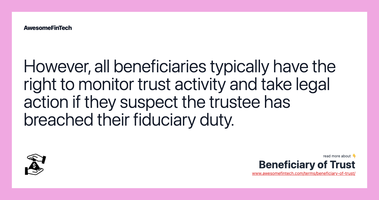 A beneficiary of trust is the individual or group of individuals for whom a trust is created. However, all beneficiaries typically have the right to monitor trust activity and take legal action if they suspect the trustee has breached their fiduciary duty. Beneficiaries of trust generally fall into two categories. One type of beneficiary is ultimately entitled to take ownership and control of trust capital and the income it generates as outlined in the trust agreement. The trust creator or grantor designates beneficiaries and a trustee, who has a fiduciary duty to manage trust assets in the best interests of beneficiaries as outlined in the trust agreement. The person who creates a trust also determines the trust beneficiary and appoints a trustee to manage the trust in the beneficiary's best interests. the trust asset's gains, losses, and expenses, such as commission fees paid out. If a trustee fails to send at least one annual report, beneficiaries can request an accounting of trust investments from the court.