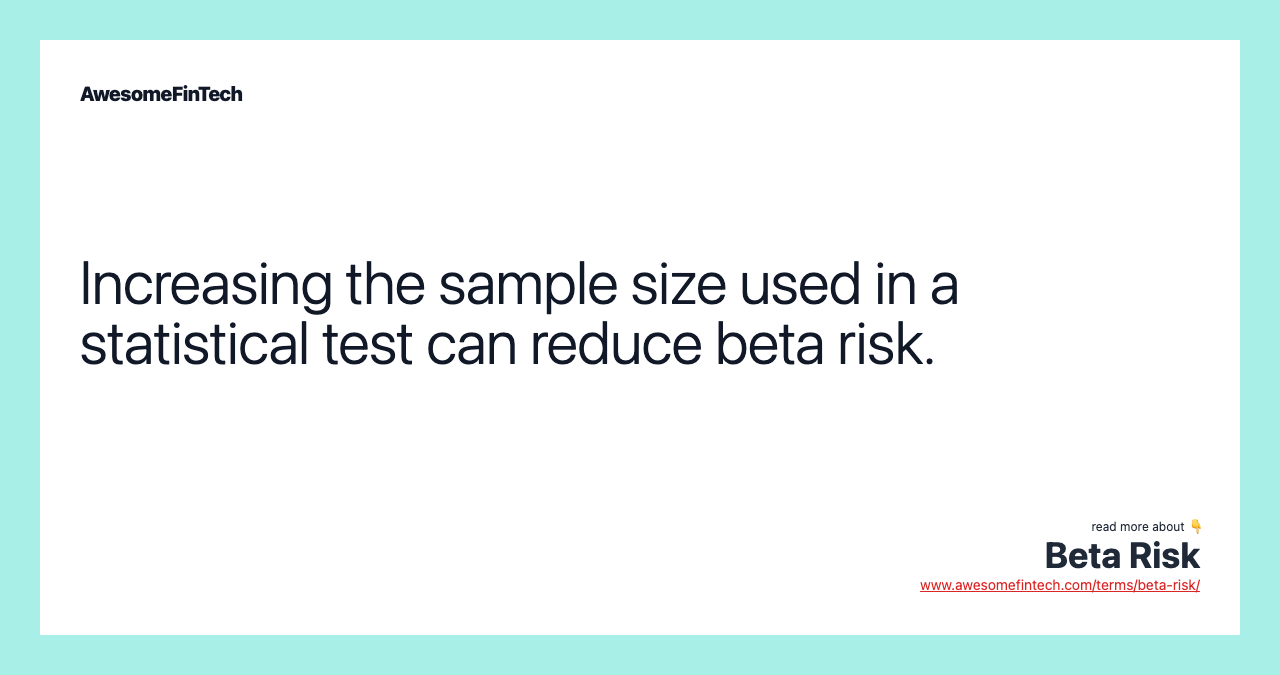 Beta risk is the probability that a false null hypothesis will be accepted by a statistical test. This is also known as a Type II error or consumer risk. In this context, the term "risk" refers to the chance or likelihood of making an incorrect decision. The primary determinant of the amount of beta risk is the sample size used for the test. Specifically, the larger the sample tested, the lower the beta risk becomes.