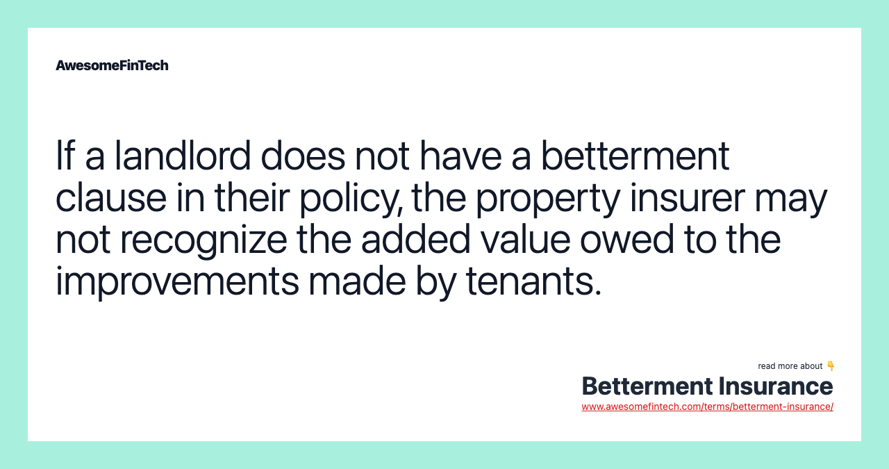 For the landlord, if the policy does not include betterment coverage showing the updated value of the structure, they may find the insurance provider will not pay enough in benefits to return the structure to its before-hazard use. Landlords may also explicitly exclude the changes but should notify tenants that they will not cover these improvements.