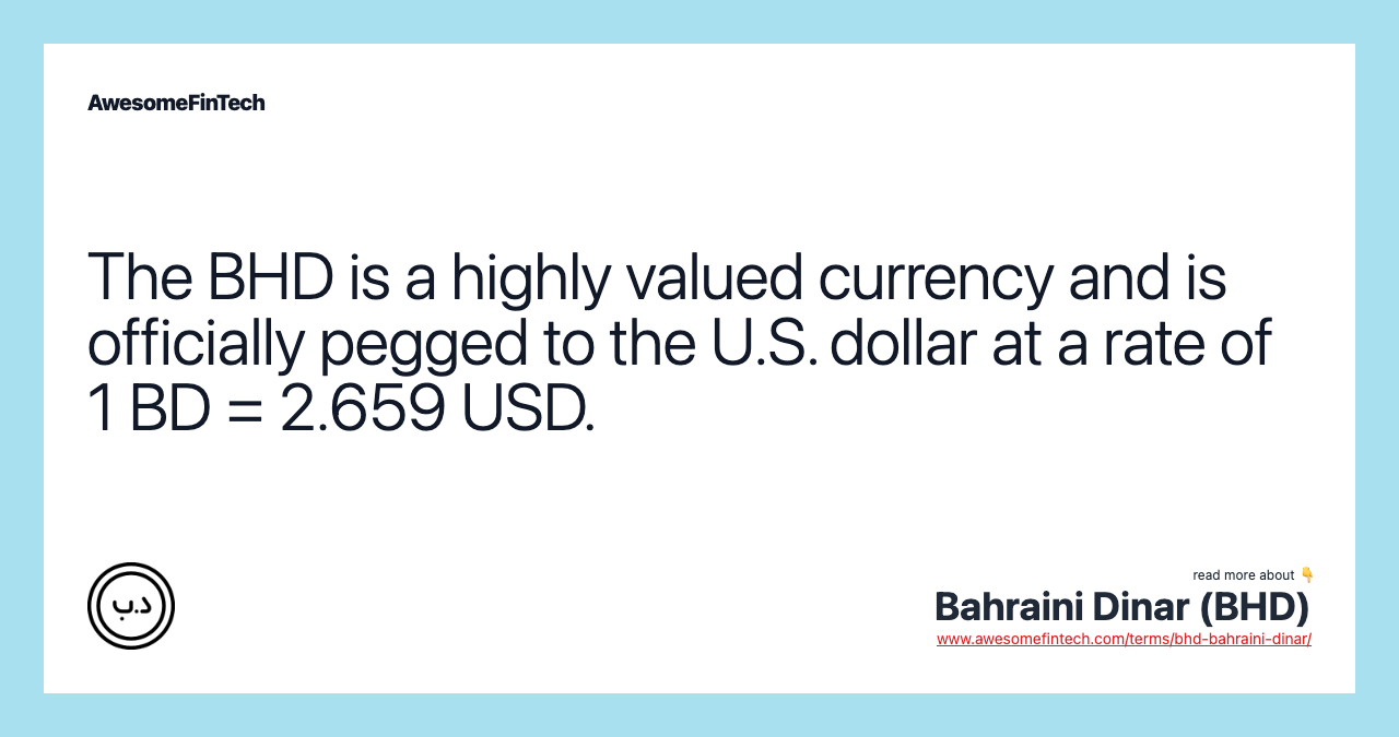 The BHD is pegged to the U.S. dollar at a rate of 2.659:1.