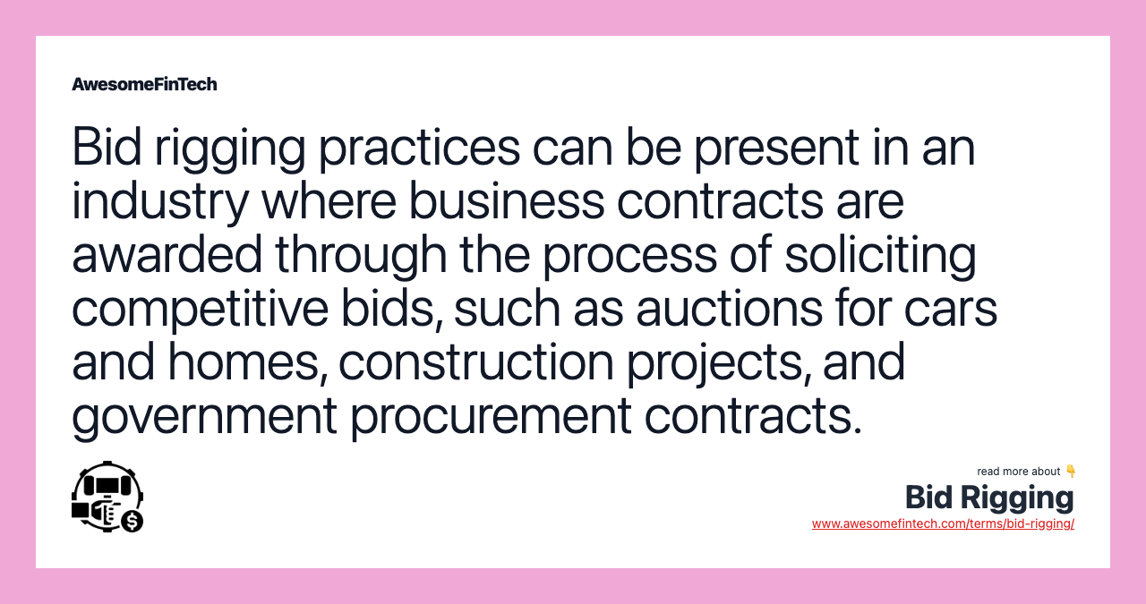 Bid rigging practices can be present in an industry where business contracts are awarded through the process of soliciting competitive bids. Examples include construction projects and government procurement contracts as well as auctions for cars and homes.
