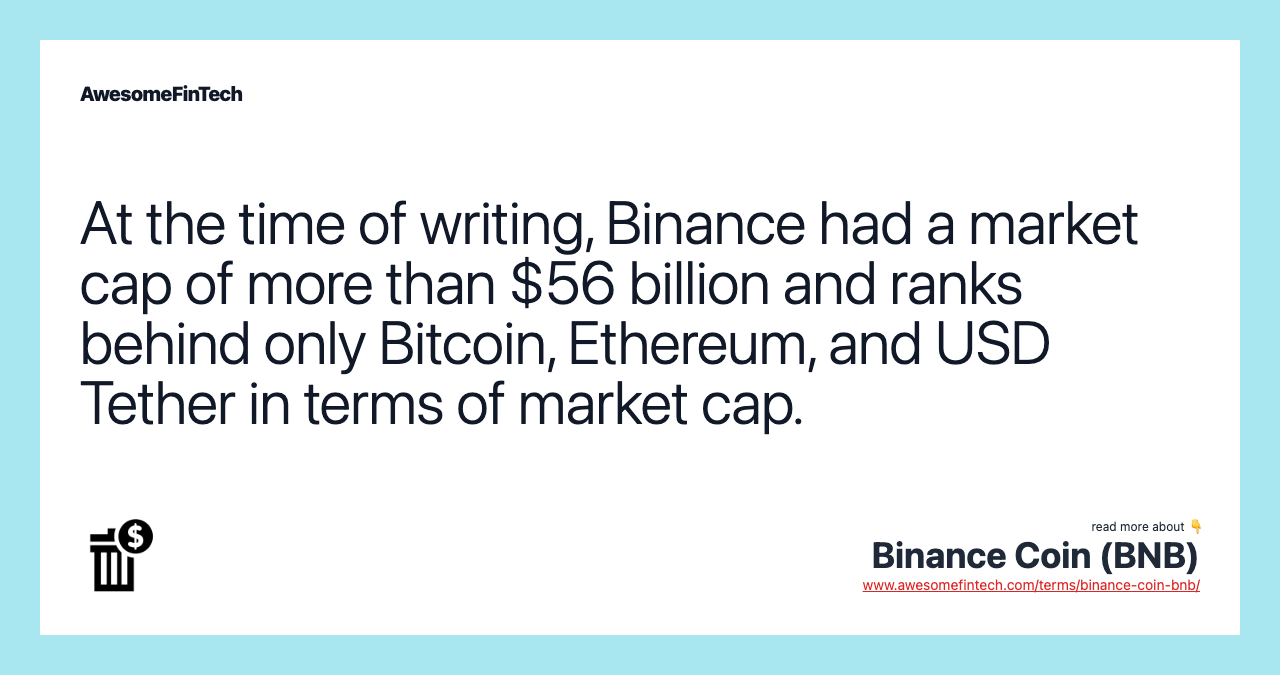 As of August 2021, BNB is the fourth-largest cryptocurrency by market capitalization, behind only Bitcoin, Ethereum, and USD Tether.