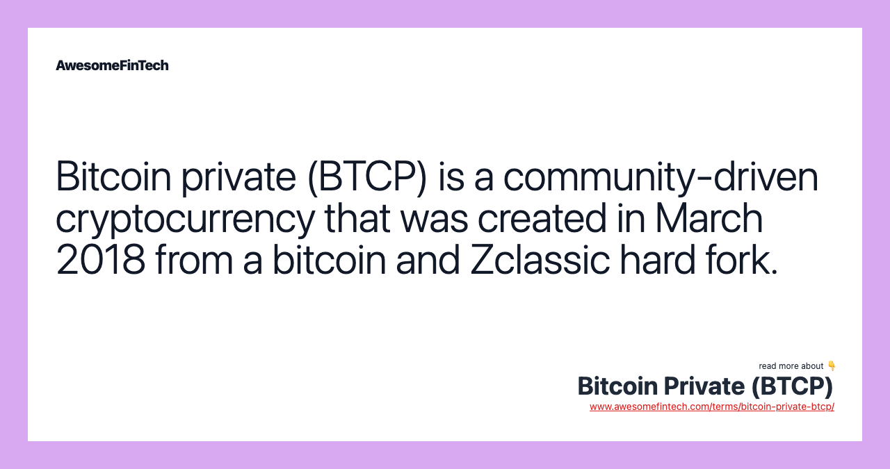 Bitcoin private is a community-driven cryptocurrency that was created in March 2018 from a bitcoin and Zclassic hard fork. Bitcoin private (BTCP) is a community-driven cryptocurrency that was created in March 2018 from a bitcoin and Zclassic hard fork. The ultimate aim behind launching Bitcoin private was to combine the inherent privacy-rich features of the Zclassic cryptocurrency with the flexibility, security, and popularity of Bitcoin. The ultimate aim behind launching Bitcoin private was to combine the inherent privacy-rich features of the Zclassic cryptocurrency with the flexibility, security, and popularity of Bitcoin. Bitcoin private attempted to solve this problem by merging Bitcoin's protocol with Zclassic’s privacy-rich features. Similar to Bitcoin, the total coin supply for Bitcoin private was intended to be capped at 21 million.