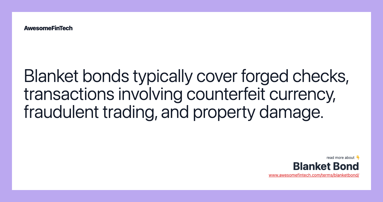A blanket bond is insurance coverage carried by brokerages, investment bankers, and other financial institutions to protect them against losses due to employee dishonesty. Examples of items that a blanket bond might cover are forged checks, transactions involving counterfeit currency, fraudulent trading, and property damage.