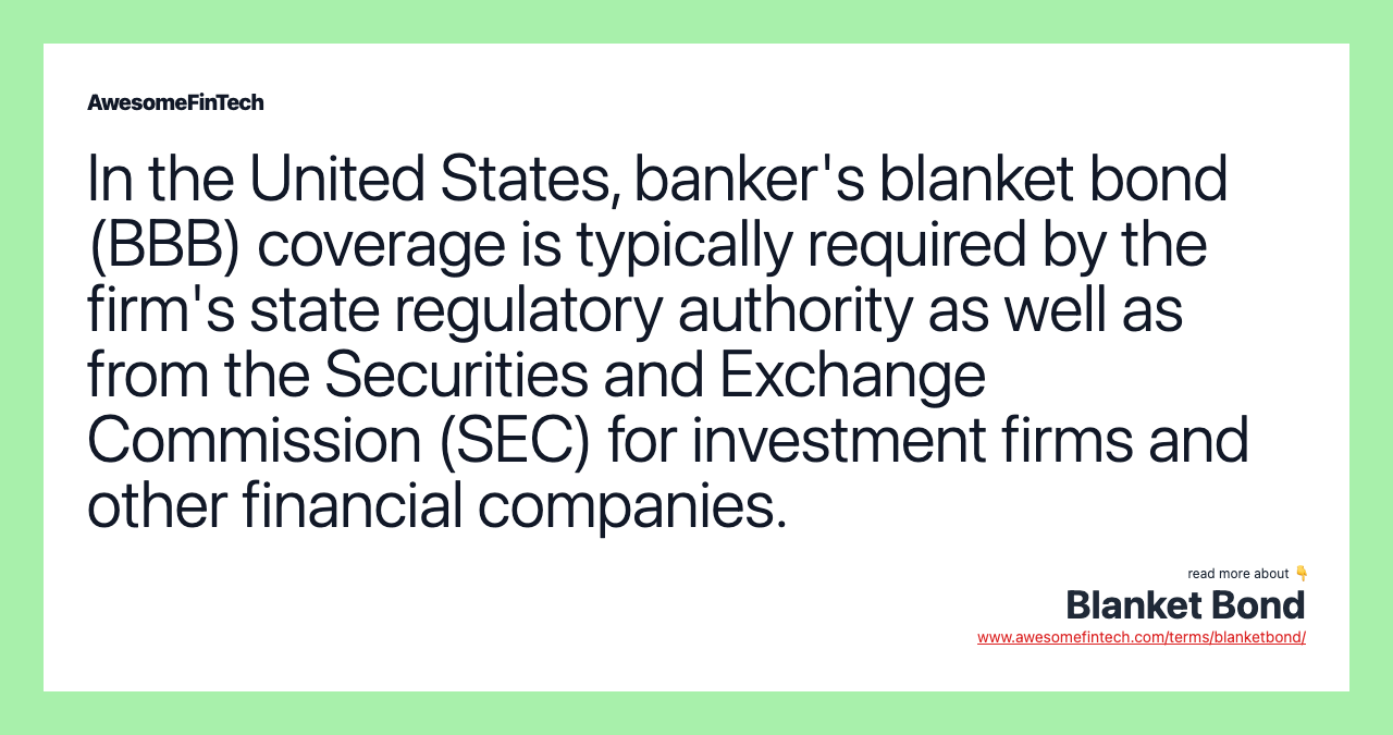 In the United States, banker's blanket bond (BBB) coverage is typically required by the firm's state regulatory authority as well as from the Securities and Exchange Commission (SEC) for investment firms and other financial companies. Blanket bonds are called "blanket" since they cover all sorts of hazards, including, but not limited to, trading fraud, embezzlement, material, intellectual theft, and forgery carried out by company employees or contractors.
