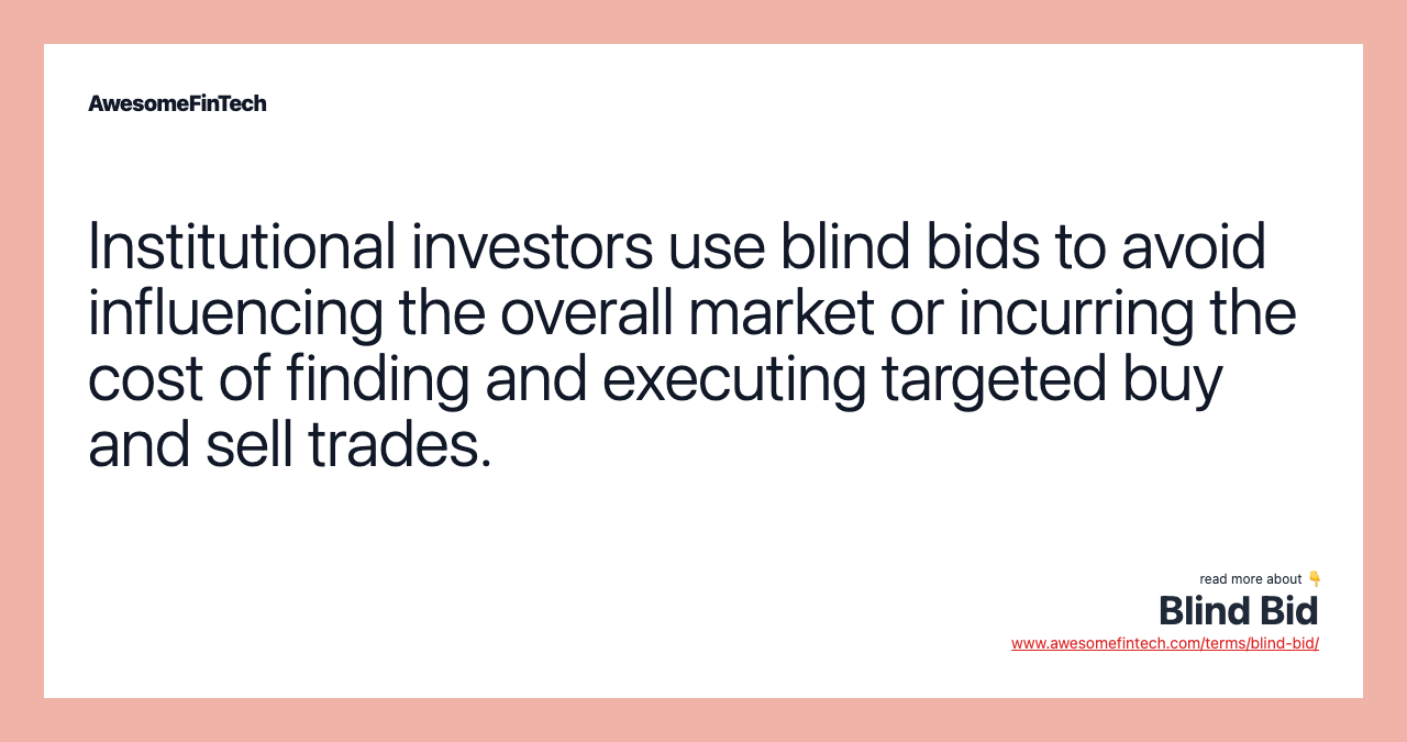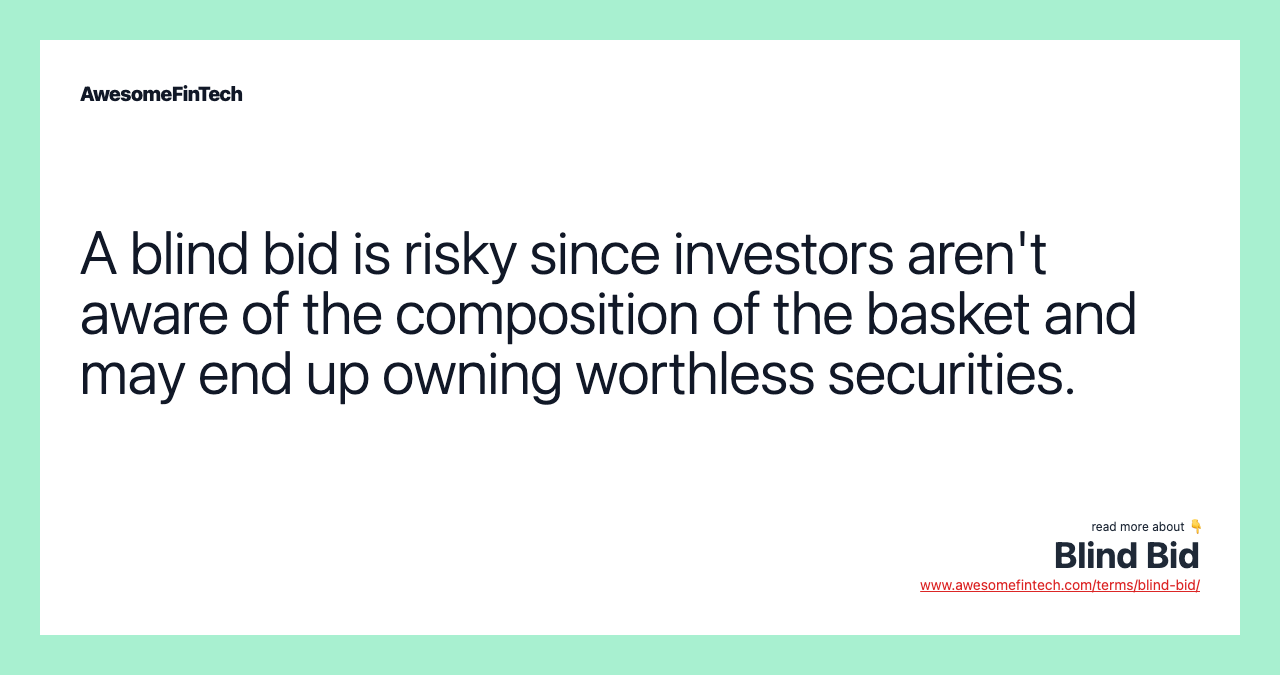 Table of Contents What Is a Blind Bid? Understanding Blind Bids Special Considerations The term blind bid refers to an offer made by investors to purchase a basket of securities without knowing which securities are included or their cost. A blind bid is an offer to purchase a bundle of securities where the investor has no knowledge of the exact securities being purchased. A blind bid is an offer to purchase a bundle of securities without knowing the exact securities being purchased. Individual investors look at factors like liquidity, volatility, and company news to determine a price to pay, whereas institutional investors make trades in the hundreds of millions of dollars and involve entire books of securities.