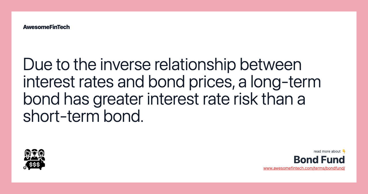Due to the inverse relationship between interest rates and bond prices, a long-term bond carries greater interest rate risk than a short-term bond. Therefore, the NAV of bond funds with longer-term maturities will be impacted greatly by changes in interest rates. This, in turn, will affect how much interest income the fund can distribute to its participants monthly.