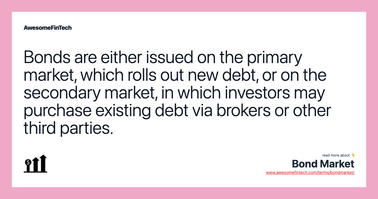 The bond market is broadly segmented into two different silos: the primary market and the secondary market. The primary market is frequently referred to as the "new issues" market in which transactions strictly occur directly between the bond issuers and the bond buyers. In essence, the primary market yields the creation of brand-new debt securities that have not previously been offered to the public.