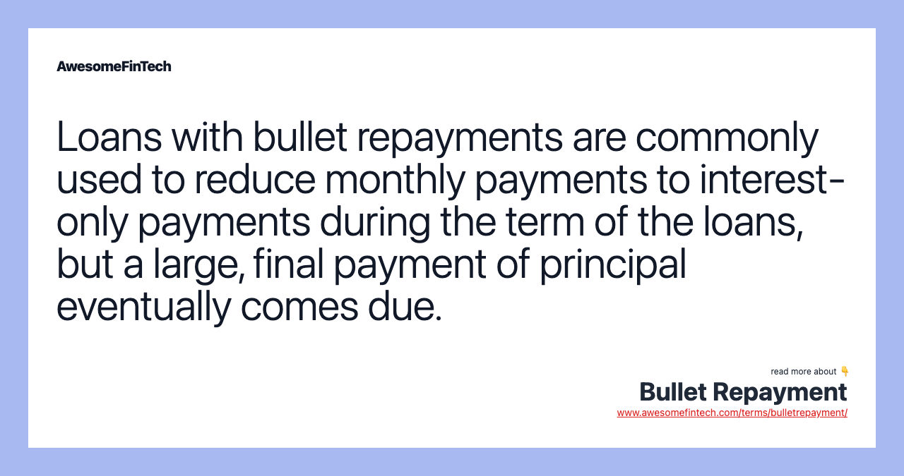 In terms of banking and real estate, loans with bullet repayments are also referred to as balloon loans. These types of loans are commonly used in mortgage and business loans to reduce monthly payments during the term of the loans.