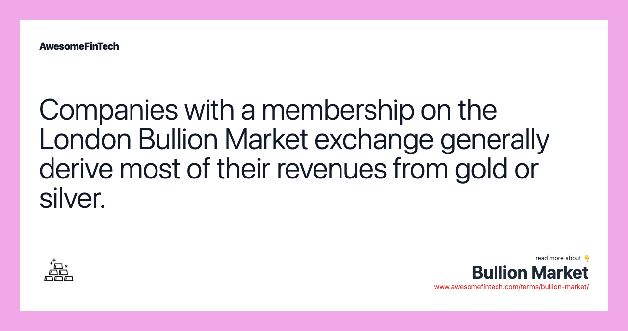 There are various bullion markets across the globe, including in London, New York, Tokyo, and Zurich. The London Bullion Market is the primary bullion market. It is an OTC market open 24 hours a day that transacts gold and silver at market spot prices, and also includes trading of forwards and options on the metals.