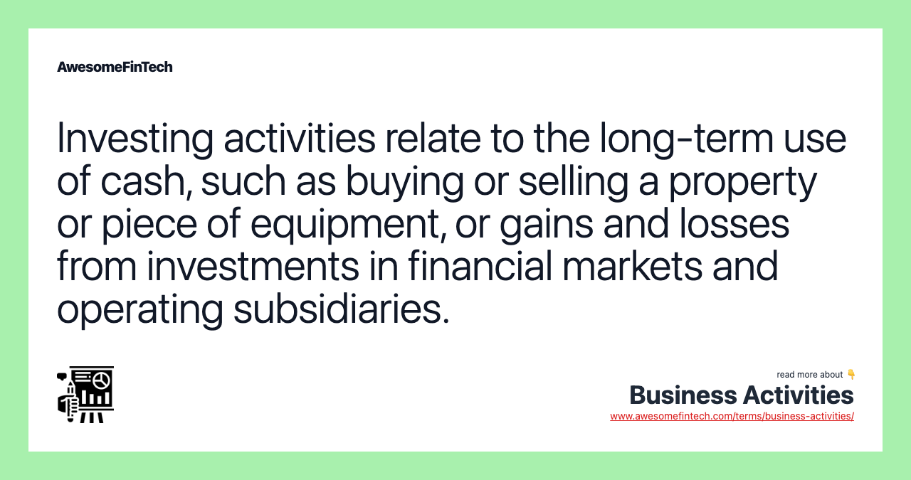 Business activities include any activity a business engages in for the primary purpose of making a profit. This is a general term that encompasses all the economic activities carried out by a company during the course of business. Business activities, including operating, investing, and financing activities, are ongoing and focused on creating value for shareholders.