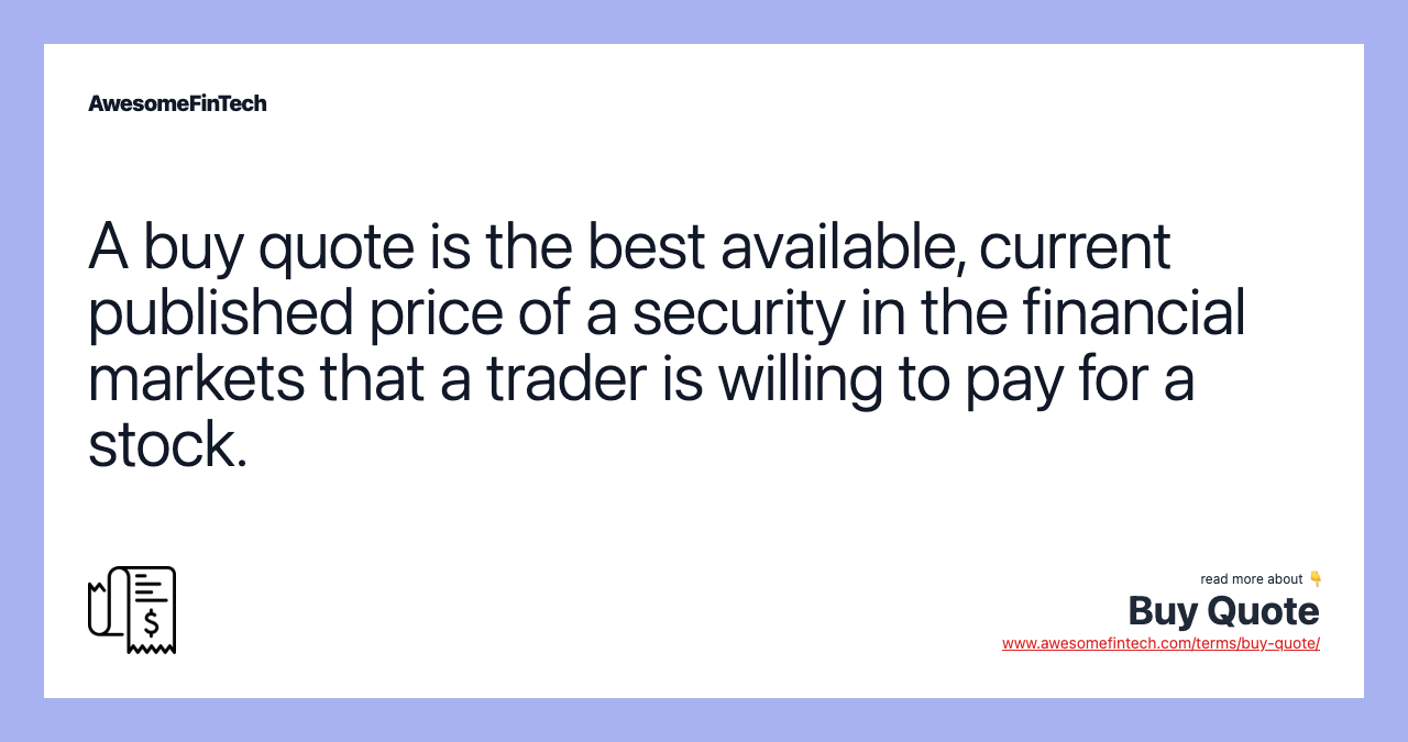 A buy quote is a number that specifies the next available purchase price for a security. It is one way of describing the best available price to buy a particular security at a given time throughout a trading session. It is what the buyer will pay for when they acquire a security and it operates in conjunction with the best-published ask price, which is the price the seller is willing to offer the security for.