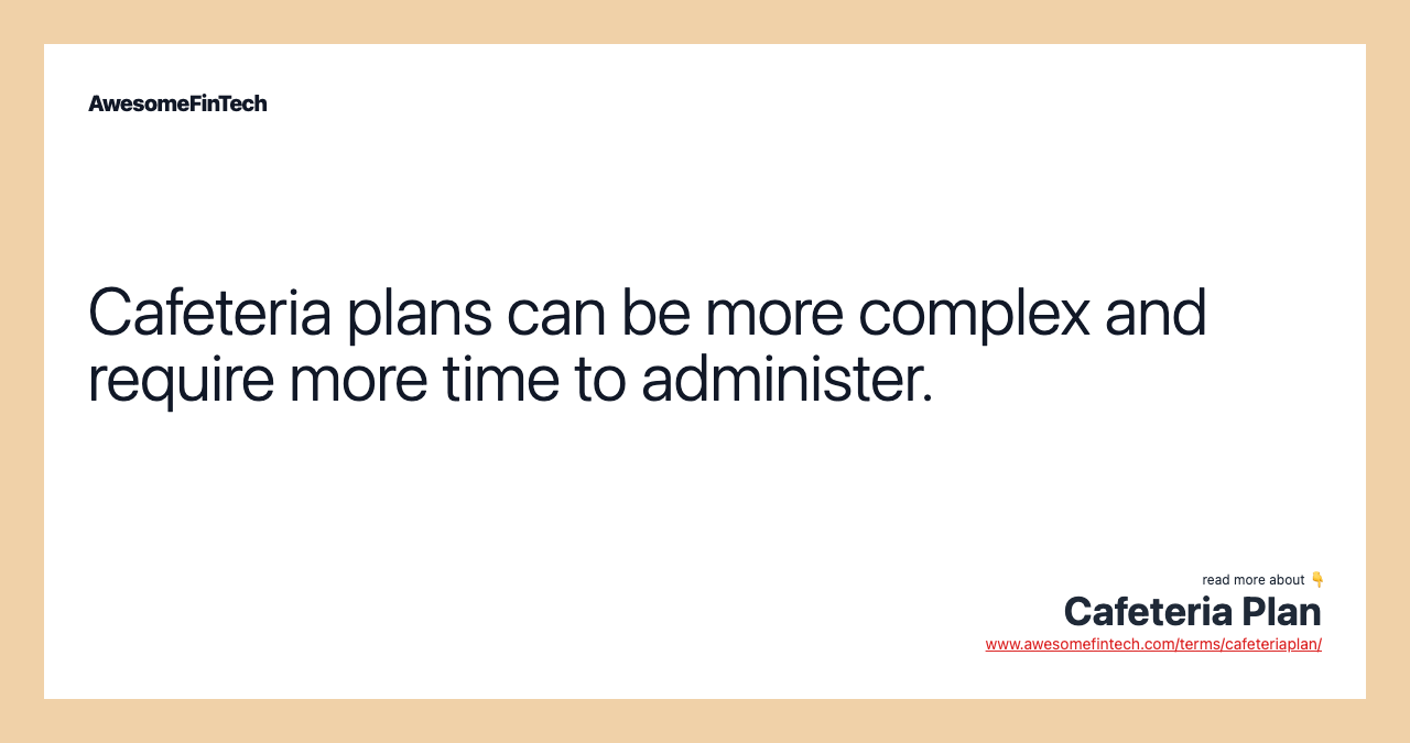 The individualized setup of cafeteria plans makes them more complex and time-consuming to administer. Employers must maintain constant communication with each employee about changes in the cost of benefits, their coverage, and their use of benefits.