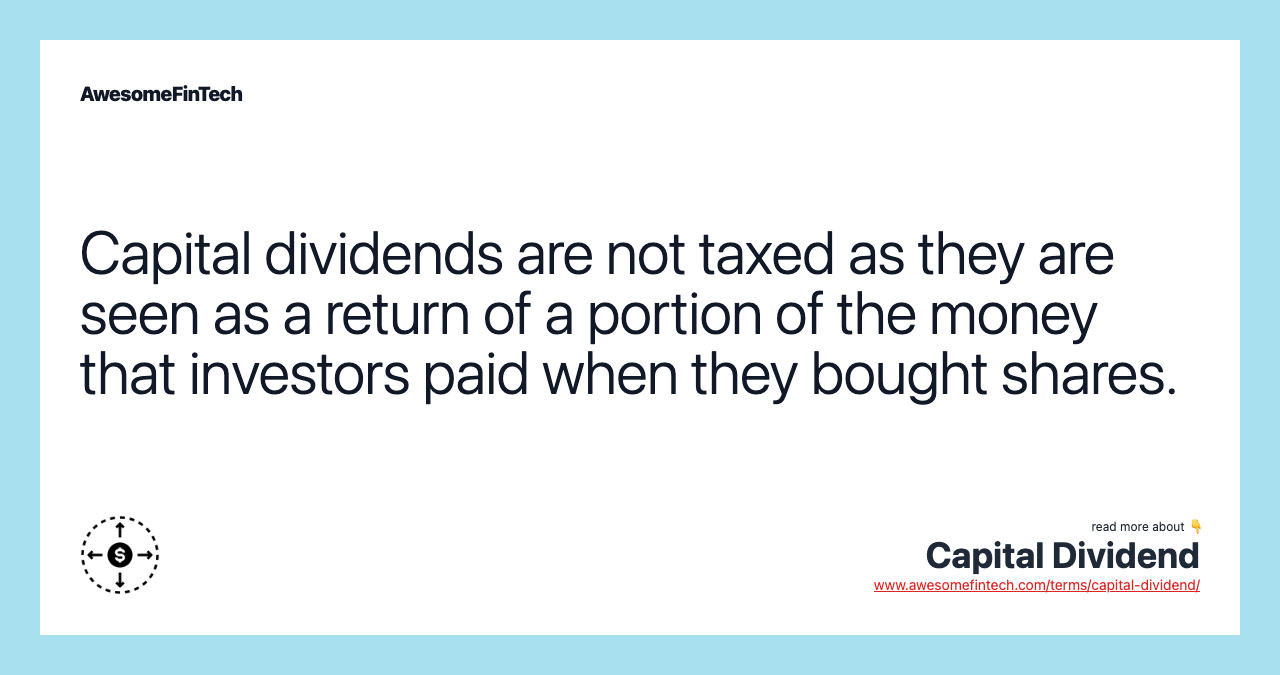 A capital dividend, also called a return of capital, is a payment that a company makes to its investors that is drawn from its paid-in-capital or shareholders' equity.