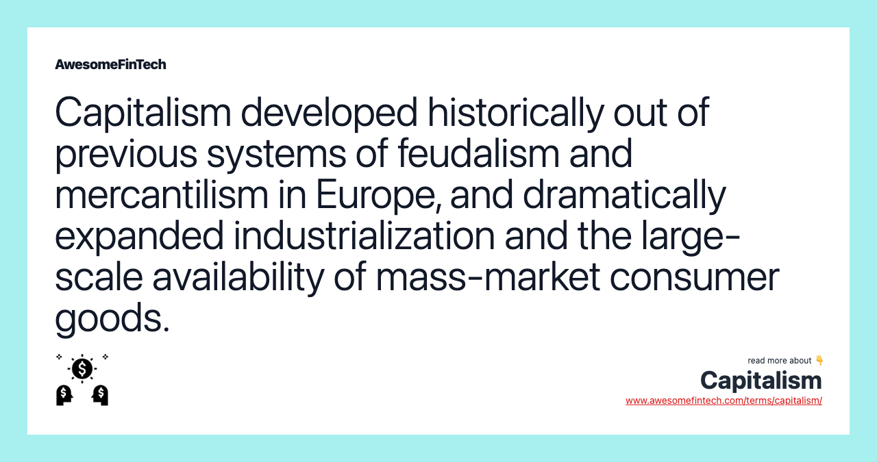 Table of Contents What Is Capitalism? Understanding Capitalism Capitalism and Private Property Capitalism, Profits, and Losses Free Enterprise or Capitalism? Feudalism the Root of Capitalism Mercantilism Replaces Feudalism Growth of Industrial Capitalism Industrial Capitalism's Effects Capitalism and Economic Growth Capitalism vs. Socialism Mixed System vs. Pure Capitalism Crony Capitalism Capitalism is an economic system in which private individuals or businesses own capital goods. In contrast, pure capitalism, also known as laissez-faire capitalism or anarcho-capitalism, (such as professed by Murray N. Rothbard) all industries are left up to private ownership and operation, including public goods, and no central government authority provides regulation or supervision of economic activity in general. When the government owns some but not all of the means of production, but government interests may legally circumvent, replace, limit, or otherwise regulate private economic interests, that is said to be a mixed economy or mixed economic system. Pure capitalism can be contrasted with pure socialism (where all means of production are collective or state-owned) and mixed economies (which lie on a continuum between pure capitalism and pure socialism).