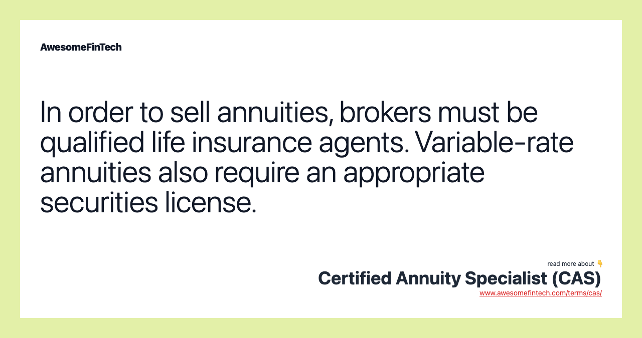 A certified annuity specialist (CAS) is a professional who holds a certification indicating expertise in fixed-rate and variable annuities. According to FINRA, a candidate must complete the following requirements to obtain the CAS designation: Prerequisite — a bachelor's degree or 2,000 hours of financial services work experience Complete a self-study program of six modules Pass three exams and a case study Complete continuing education requirements of 30 hours every two years A certified annuity specialist (CAS) is a professional who holds a certification indicating expertise in fixed-rate and variable annuities. A certified annuity specialist (CAS) is a certified expert in fixed-rate and variable annuities. Variable-rate annuities are further regulated by the SEC and FINRA, and brokers are required to have both the Series 6 and Series 63 securities licenses in addition to state life insurance requirements.