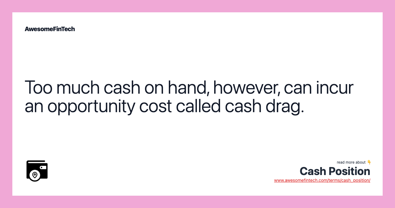 While a cash position provides a liquidity reserve and a buffer against losses, cash by itself earns only the risk-free rate of return and too much cash holdings can be an opportunity cost. "Cash drag" is a common source of performance drag in a portfolio. It refers to holding a portion of a portfolio in cash rather than investing in this portion in the market.