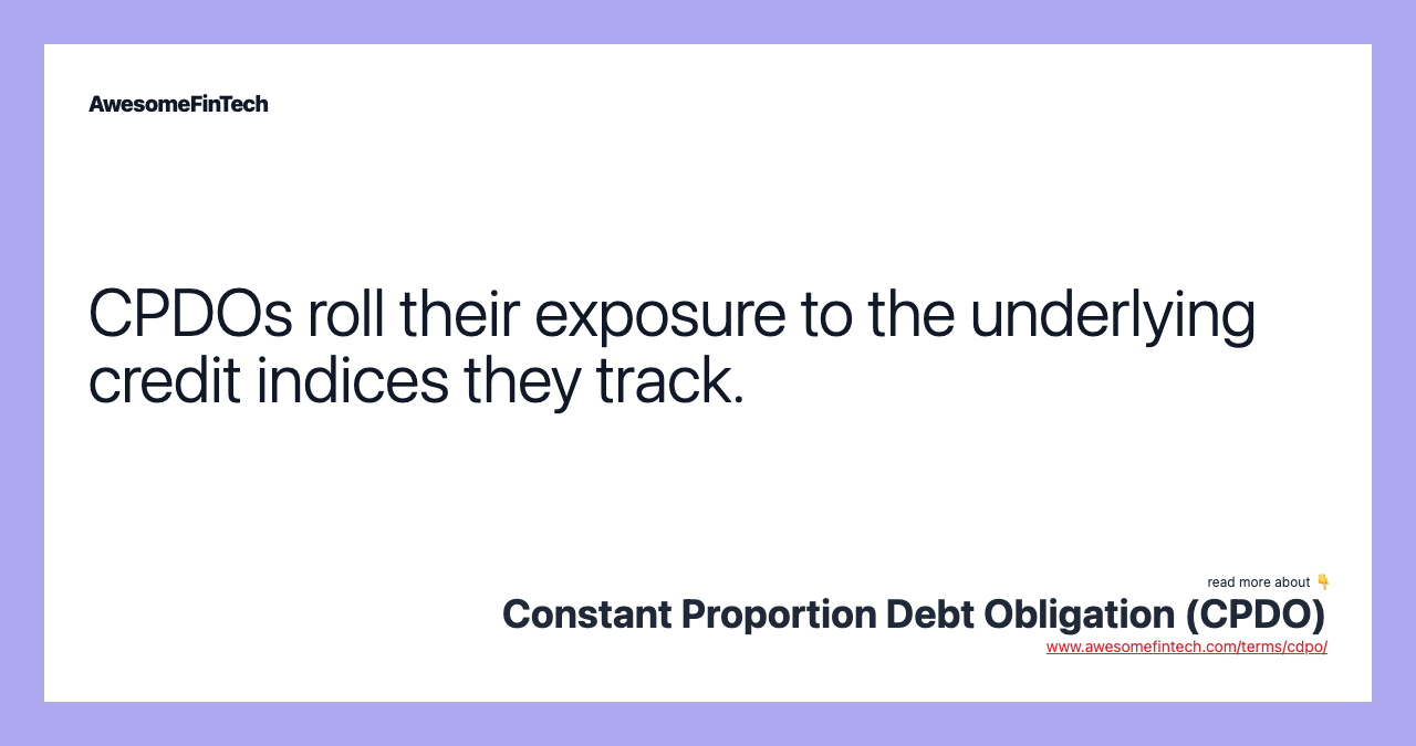 Constant proportion debt obligations (CPDO) are incredibly complex debt securities that promise investors the high yields of junk bonds with the low-default risk of investment-grade bonds. CPDOs do this by rolling their exposure to the underlying credit indices they track, such as the Thomson Reuters Eikon code (iTraxx) or the credit default swap index (CDX).