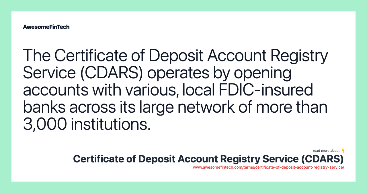 The Certificate of Deposit Account Registry Service (CDARS) is a for-profit service run by the Promontory Interfinancial Network (which was founded by a group of former financial regulators in 2003). CDARS comprises a network of more than 3,000 American banks and savings institutions. It is used by individuals, public funds, businesses, nonprofits, credit unions, and financial advisors.