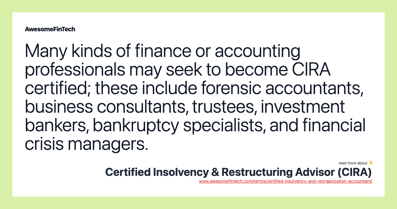 A Certified Insolvency & Restructuring Advisor (CIRA) is a professional certification available to individuals who specialize in working with businesses that are going through the process of bankruptcy, restructuring, turnaround, or insolvency. Examples of specialized experience include performing duties as a: Financial advisor for a trustee, debtor, creditor, or equity holder committee Business turnaround specialist, including business receivers and reorganization management or consultants Bankruptcy trustee, bankruptcy examiner, or accountant for an examiner Lender working in special assets or loan restructuring The candidate must also complete and submit at least two case studies demonstrating specialized experience. A Certified Insolvency & Restructuring Advisor (CIRA) is a professional certification available to individuals who specialize in working with businesses that are going through the process of bankruptcy, restructuring, turnaround, or insolvency. CIRA candidates must also have five years of financial or accounting experience and 4,000 hours of specialized experience in restructuring and insolvency. Many kinds of finance or accounting professionals may seek to become CIRA certified; these include forensic accountants, business consultants, trustees, investment bankers, bankruptcy specialists, and financial crisis managers.