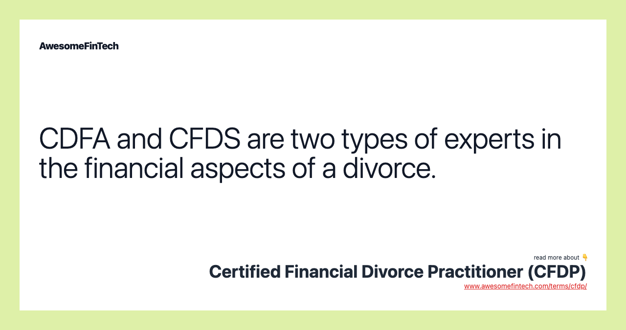 A Certified Divorce Financial Practitioner (CDFP) was a specialized credential, no longer issued, that signaled knowledge of tax law, asset distribution, and short- and long-term financial planning applied to divorce settlements. Certified divorce financial analysts can help couples navigate new financial terrain during and after a divorce, such as how to divide retirement accounts, and even how to set up a new budget for expenses after a divorce. A Certified Divorce Financial Practitioner (CDFP) was a specialized credential, no longer issued, that signaled knowledge of tax law, asset distribution, and short- and long-term financial planning applied to divorce settlements. A Certified Divorce Financial Analyst (CDFA) uses their knowledge of tax law, asset distribution, and short- and long-term financial planning to achieve equitable divorce settlements. A Canadian designation, known as the Chartered Financial Divorce Specialist (CFDS), similarly trains financial planners to help clients with their finances regarding matters of cohabitation, separation, and divorce.