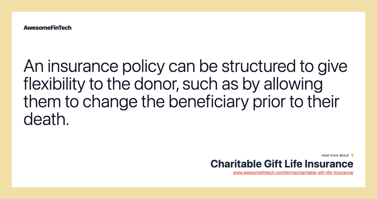Table of Contents Charitable Gift Life Insurance An insurance policy can be structured to give flexibility to the donor, such as by allowing them to change the beneficiary prior to their death. Charitable gift life insurance can be a convenient vehicle for philanthropy for several reasons. In doing so, the donor pays the premiums on the life insurance policy, with the intention that proceeds from the policy will be paid to one or more charitable organizations upon the donor's death. Depending on the details of the insurance contract, the donor may or may not retain the right to change the beneficiary of the life insurance policy prior to their death. Charitable gift life insurance refers to a life insurance policy where the beneficiary is a registered charity.