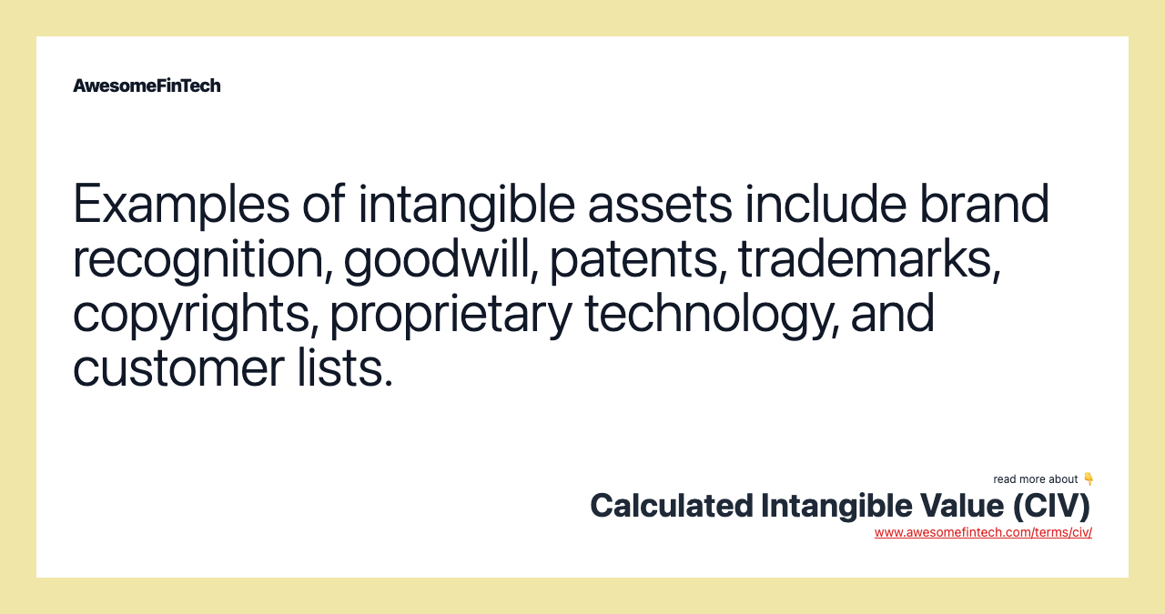 Calculated intangible value is a method of valuing a company's intangible assets. This calculation attempts to allocate a fixed value to intangible assets that won't change according to the company's market value. An intangible asset is a non-physical asset. Examples of intangible assets include patents, trademarks, copyrights, goodwill, brand recognition, customer lists, and proprietary technology.