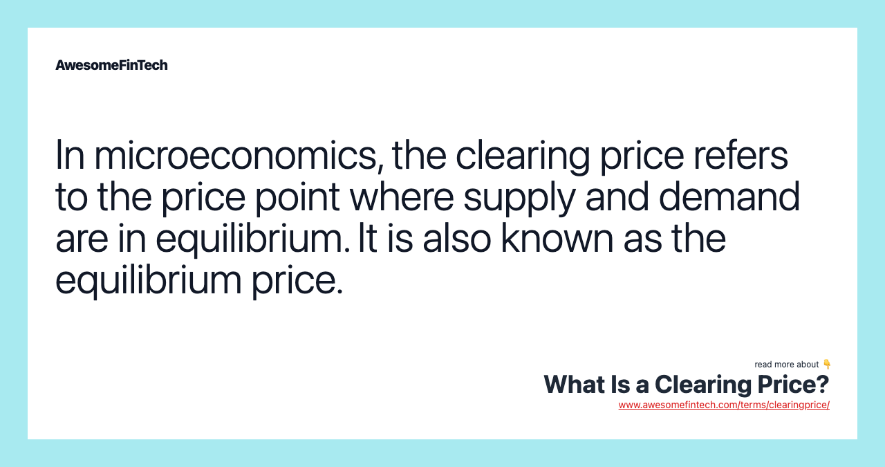 The phrase "equilibrium price" is often used interchangeably with "market clearing price." Both refer to the price at which the number of goods for sale is exactly equal to the quantity that buyers wish to purchase. In other words, it is the price at which the market is in equilibrium.
