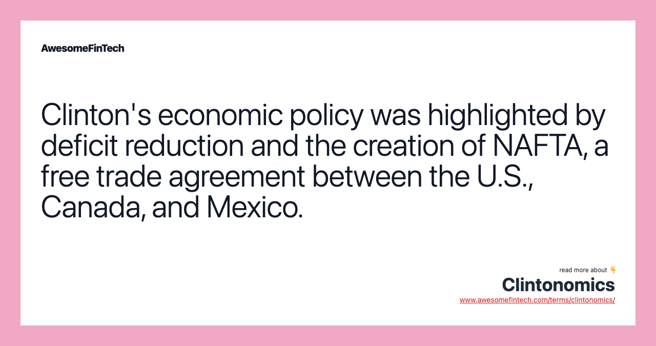 Clintonomics refers to the economic philosophy and policies promulgated by President Bill Clinton, who was president of the United States from 1993 to 2001. The primary form of globalization was in the form of the passage of the North American Free Trade Agreement (NAFTA), and encouraging China’s accession to the World Trade Organization (WTO). Bill Clinton came to office while the United States was still recovering from the Great Recession that began in 1991. Clinton’s dedication to free trade has also come under increasing attack, with critics claiming that the president did not do enough to secure the rights of U.S. workers and ensure that U.S. wages would not suffer from the passage of NAFTA. Some have criticized Clinton's economic policy as continuing the practices that supported deregulation, which may have led to the 2008 financial crisis, as well as free trade agreements that may not have favored American workers. Clinton's economic policy was highlighted by deficit reduction and the creation of NAFTA, a free trade agreement between the U.S., Canada, and Mexico.