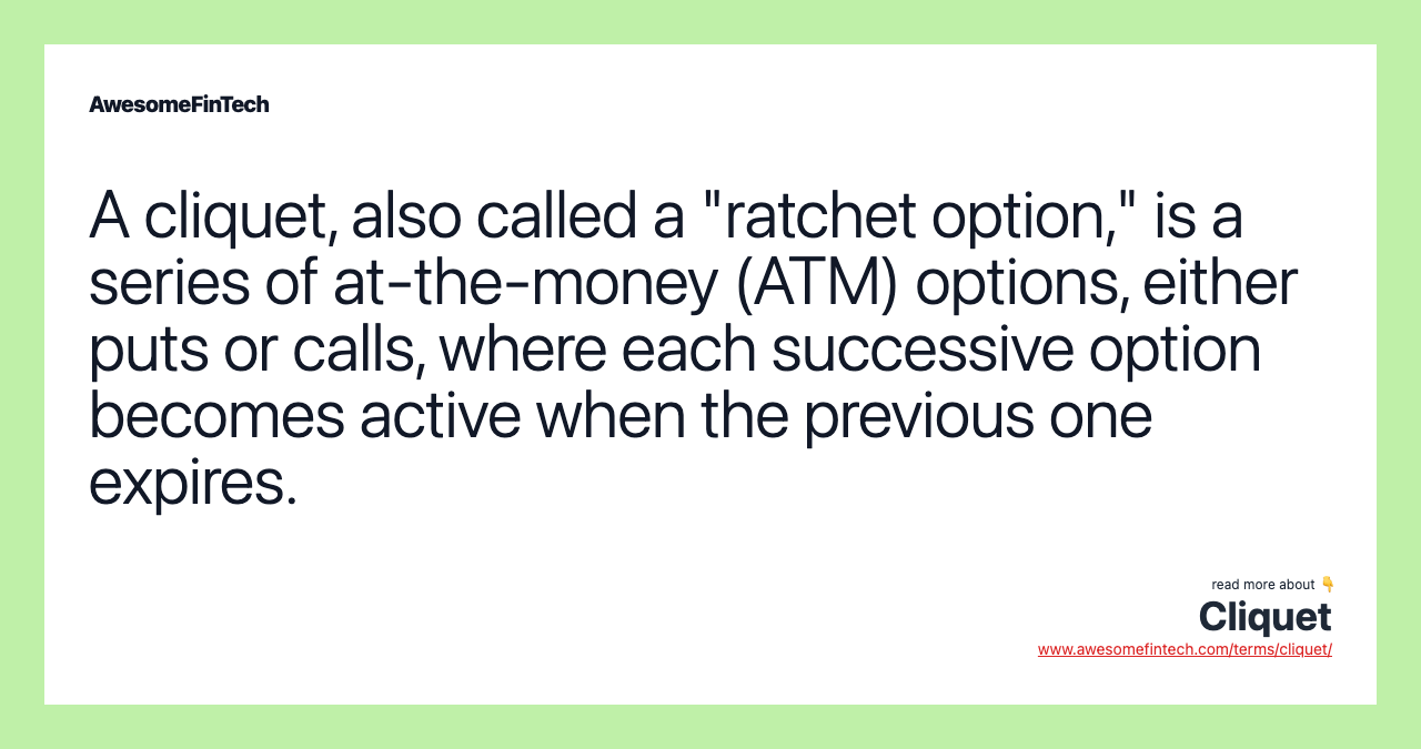 A cliquet, also called a "ratchet option," is a series of at-the-money (ATM) options, either puts or calls, where each successive option becomes active when the previous one expires.