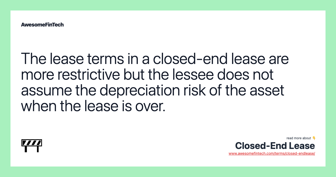 A closed-end lease is a rental agreement that puts no obligation on the lessee (the person making periodic lease payments) to purchase the leased asset at the end of the agreement. A closed-end lease is a rental agreement that puts no obligation on the lessee (the person making periodic lease payments) to purchase the leased asset at the end of the agreement. In an open-end lease, suppose your lease payments are based on the assumption that the $20,000 new car that you are leasing will be worth only $10,000 at the end of your lease agreement. Since the lessee has no obligation to purchase the leased asset upon lease expiration and does not have to worry about whether the asset will depreciate more than expected throughout the course of the lease, it is argued that closed-end leases are better for the average person. The lease terms in a closed-end lease are more restrictive but the lessee does not assume the depreciation risk of the asset when the lease is over.