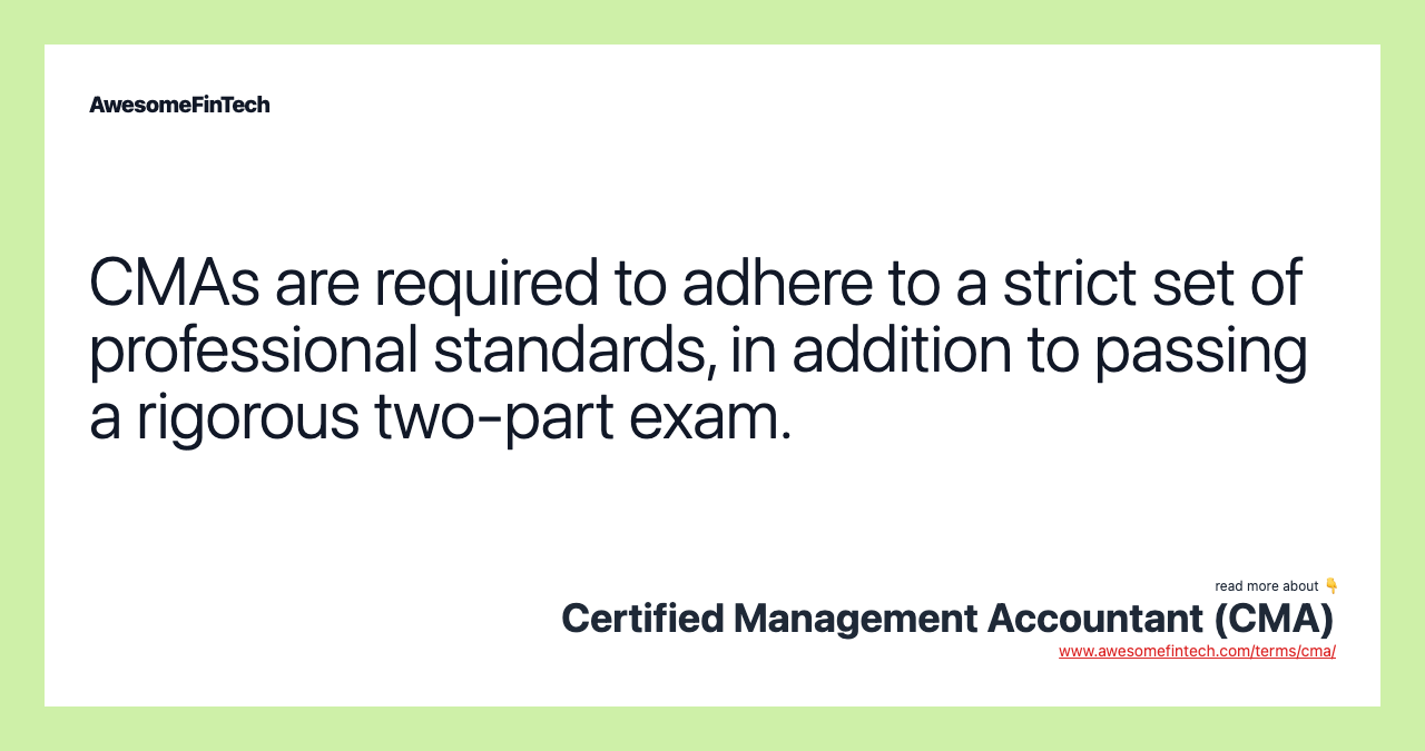 As with other financial designations such as certified public accountant (CPA) or chartered financial analyst (CFA) certifications, certified management accountants (CMAs) are subject to a strict code of ethics. To obtain the CMA, candidates must have a bachelor’s degree or a related professional certification as well as two years of continuous work experience in a related field. Candidates must also pass a rigorous exam, which typically requires over 300 hours of preparation.