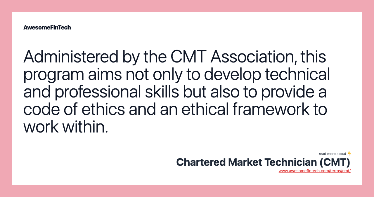 To be granted a Chartered Market Technician (CMT®) designation, a candidate must pass three examination levels, complete the membership application process, and agree to the CMT Association’s code of ethics.