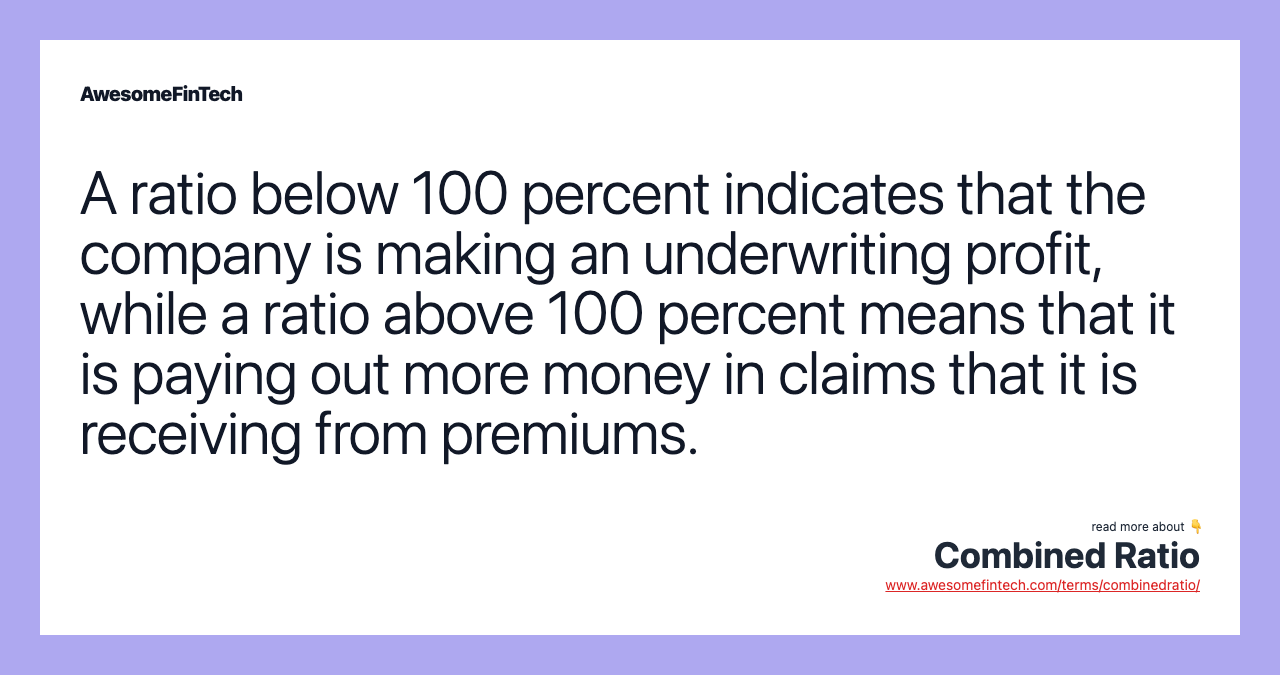 The combined ratio is typically expressed as a percentage. A ratio below 100 percent indicates that the company is making an underwriting profit, while a ratio above 100 percent means that it is paying out more money in claims that it is receiving from premiums. Even if the combined ratio is above 100 percent, a company can potentially still be profitable because the ratio does not include investment income.