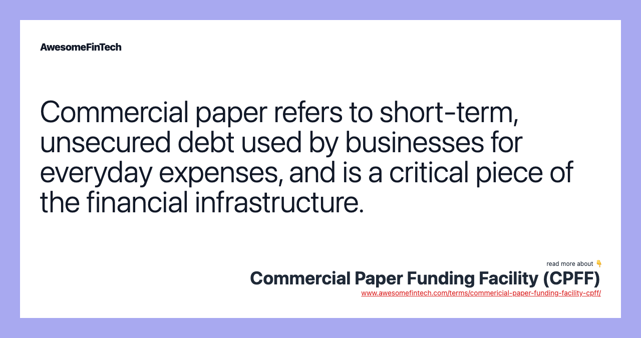 The Commercial Paper Funding Facility (CPFF) is an institution created by the Federal Reserve Bank of New York on October 27, 2008, as a result of the credit crunch faced by financial intermediaries in the commercial paper market during the height of the financial crisis that gave way to the Great Recession. The Commercial Paper Funding Facility (CPFF) is an institution created by the Federal Reserve Bank of New York on October 27, 2008, as a result of the credit crunch faced by financial intermediaries in the commercial paper market during the height of the financial crisis that gave way to the Great Recession. At the time the CPFF was created, the commercial paper market was experiencing significant strain because investors, including money market mutual funds, were hesitant to purchase commercial paper, especially with longer-dated maturities, given that these investors were already struggling with liquidity pressures. The SPV used by the CPFF purchases and holds three-month unsecured commercial paper and asset-backed commercial paper at a discounted rate until maturity The Commercial Paper Funding Facility (CPFF) was a Federal Reserve-led response to support the commercial paper market as it floundered at the height of the 2008-09 financial crisis.