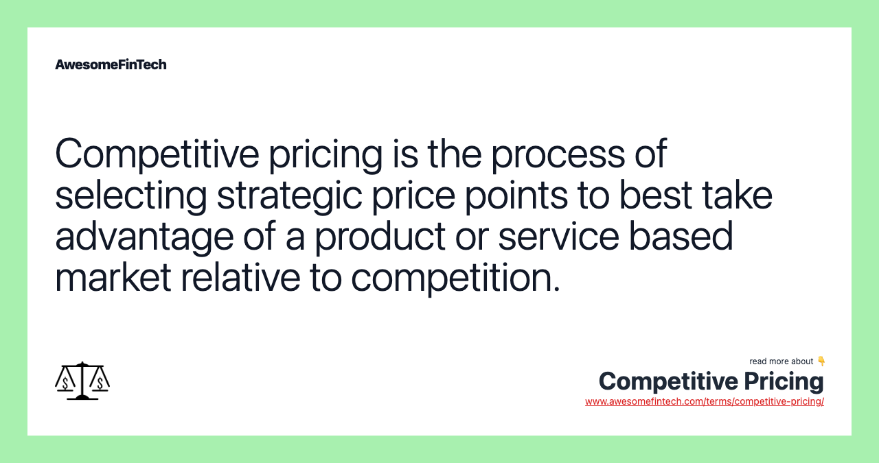 Competitive pricing is the process of selecting strategic price points to best take advantage of a product or service based market relative to competition. This pricing method is used more often by businesses selling similar products since services can vary from business to business, while the attributes of a product remain similar. This type of pricing strategy is generally used once a price for a product or service has reached a level of equilibrium, which occurs when a product has been on the market for a long time and there are many substitutes for the product.