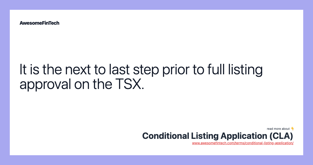A conditional listing application (CLA) is an interim step in the listing process for a company that seeks to be listed on the Toronto Stock Exchange (TSX).