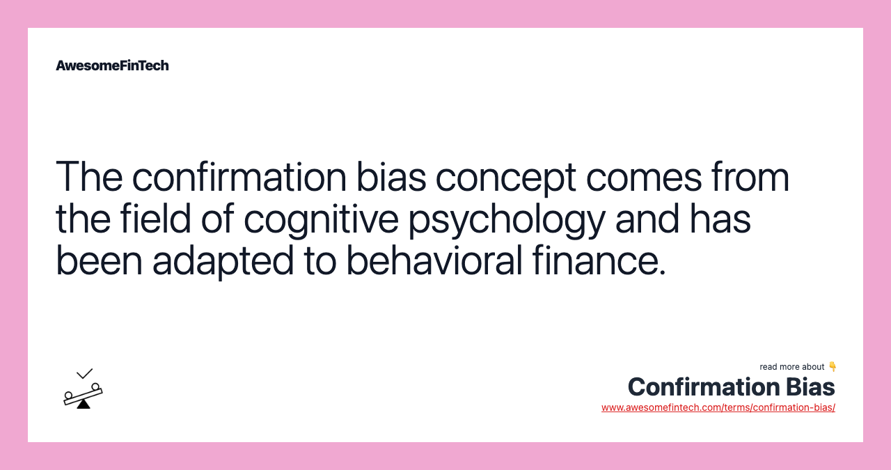 Confirmation bias is a term from the field of cognitive psychology that describes how people naturally favor information that confirms their previously existing beliefs. Confirmation bias flourishes because it's an efficient way to process information, it promotes self-esteem, and it eases stress by eliminating conflict and contradictions. Investors should be aware of their own tendency towards confirmation bias so that they can overcome poor decision-making, missing chances, and avoid falling prey to bubbles. A related syndrome to confirmation bias is belief perseverance or persistence: the inability of people to change their own belief even upon receiving new information or facts that contradict or refute that belief. Confirmation bias is a term from the field of cognitive psychology that describes how people naturally favor information that confirms their previously existing beliefs. This sort of confirmation bias relates to making a decision or adopting a view and then seeking information that supports it.