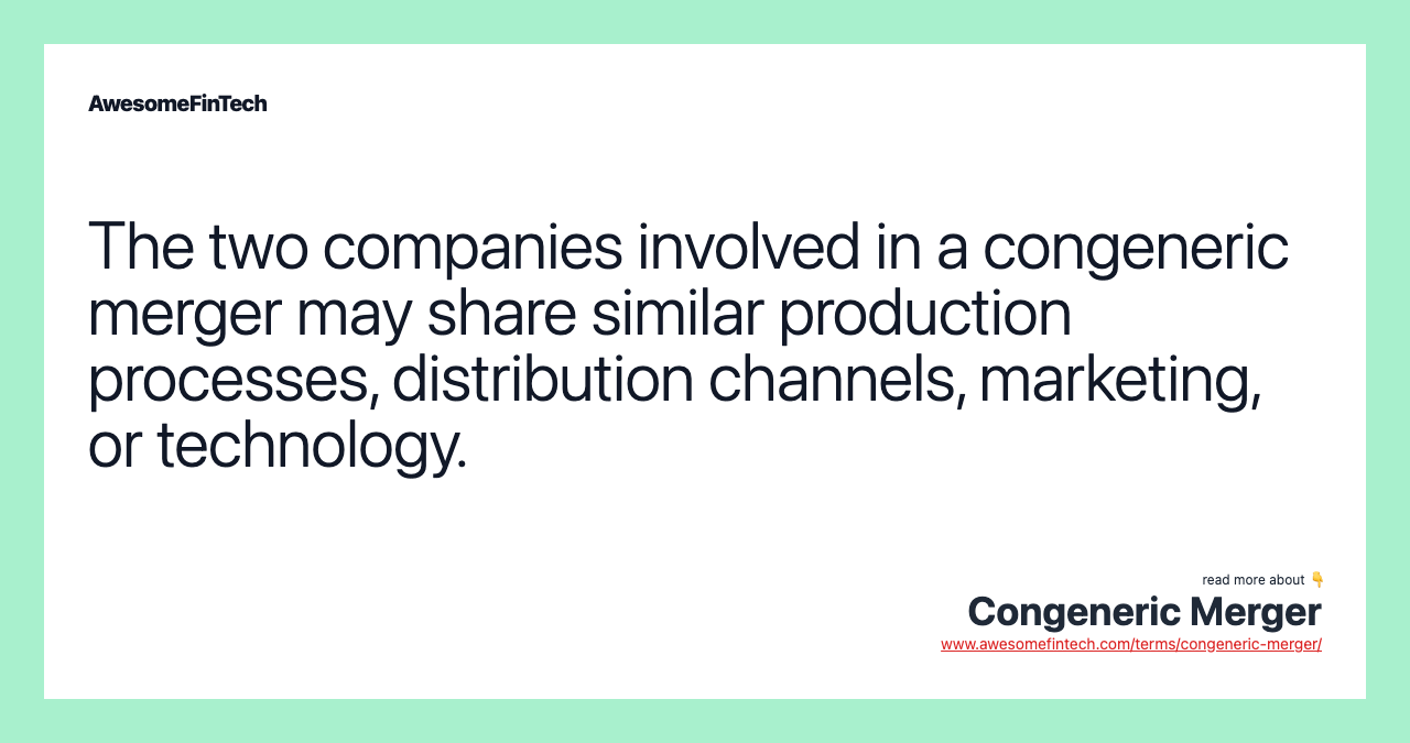 A congeneric merger is a type of merger where two companies are in the same or related industries or markets but do not offer the same products. A product extension merger is a kind of congeneric merger where the product line of one company is added to the product line of the other. In contrast to a congeneric merger, where the target and the acquirer are in similar industries, a conglomerate merger occurs between companies that are in no way related. A congeneric merger can allow a target and its acquirer to take advantage of overlapping technology or production processes to expand their product line or increase their market share. A congeneric merger is where the acquiring company and the target company are in the same or related industry but have different business lines or products.