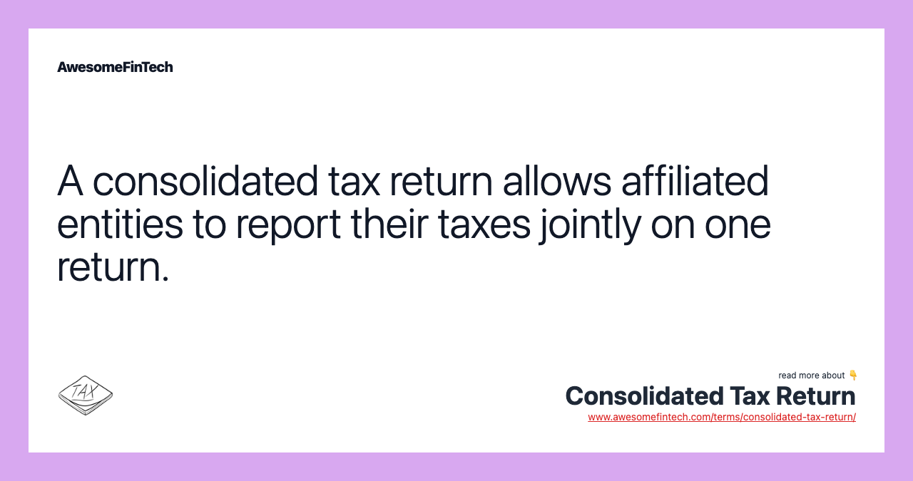 A consolidated tax return is a corporate income tax return of an affiliated group of corporations, who elect to report their combined tax liability on a single return. The purpose of the tax return allows for corporations that run their business through many legal affiliates to be viewed as one single entity. Common items that are consolidated include capital gains, net losses, and certain deductions, such as from charitable contributions or net operating losses.