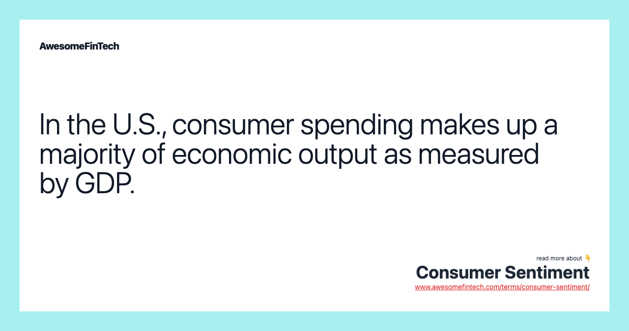 In the U.S., consumer spending makes up a majority of economic output. As much as 70% of gross domestic product (GDP) is driven by a consumer spending component, so the sentiment or attitude of consumers goes a long way in gauging the health of the economy. The other main drivers of GDP are business investments, government spending, and net exports.