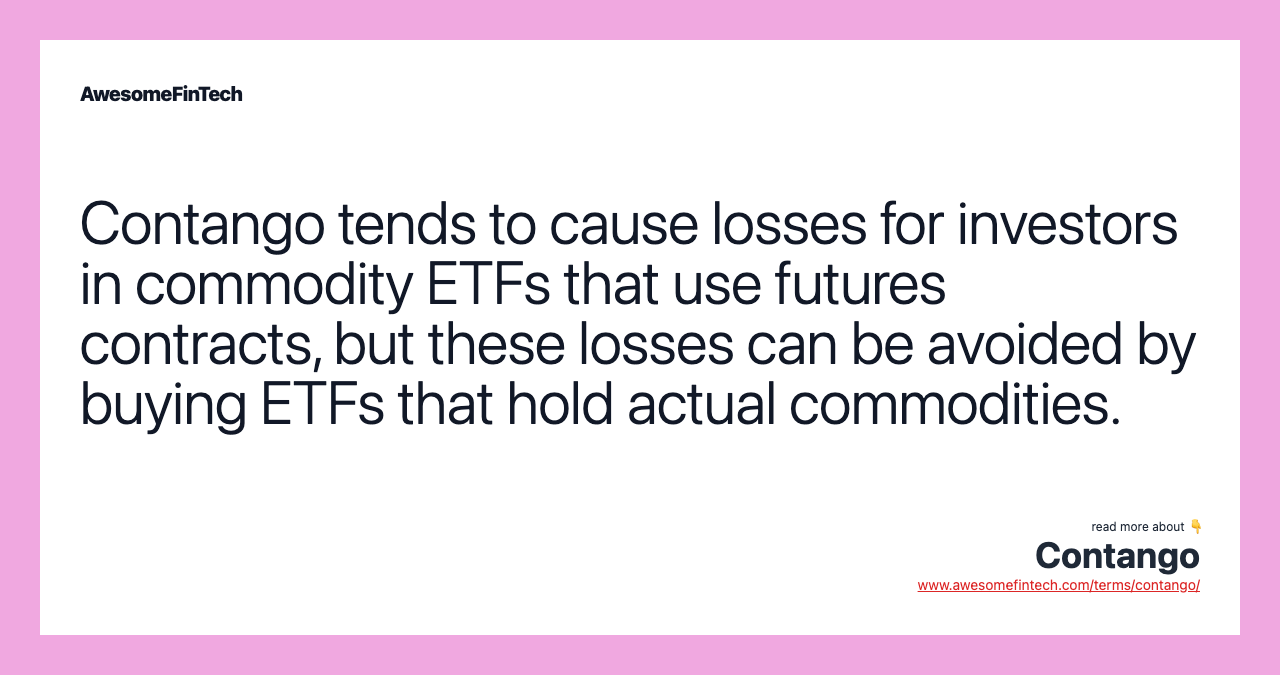 Fortunately, the loss caused by contango is limited to commodity ETFs that use futures contracts, such as oil ETFs. Gold ETFs and other ETFs that hold actual commodities for investors do not suffer from contango.