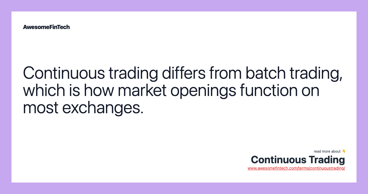 Continuous trading forms the basis for all types of trades across secondary exchanges in the United States. It can be compared to batch trading, which is the opposite of continuous trading and occurs only at the market open.