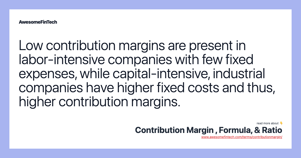 Very low or negative contribution margin values indicate economically nonviable products whose manufacturing and sales should be discarded. Low values of contribution margins can be observed in the labor-intensive industry sectors like manufacturing as the variable costs are higher, while high values of contribution margins are prevalent in the capital-intensive sectors.
