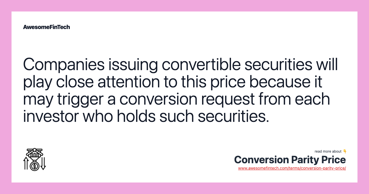 Conversion parity price can be viewed as the minimum price that the investor is looking for when considering exercising the conversion option in a convertible security. Essentially, when the issuing company’s stock price is equal to or greater than the conversion parity price, an investor should consider converting. Convertible securities are often callable, so the issuer can force the hand of investors in this matter.