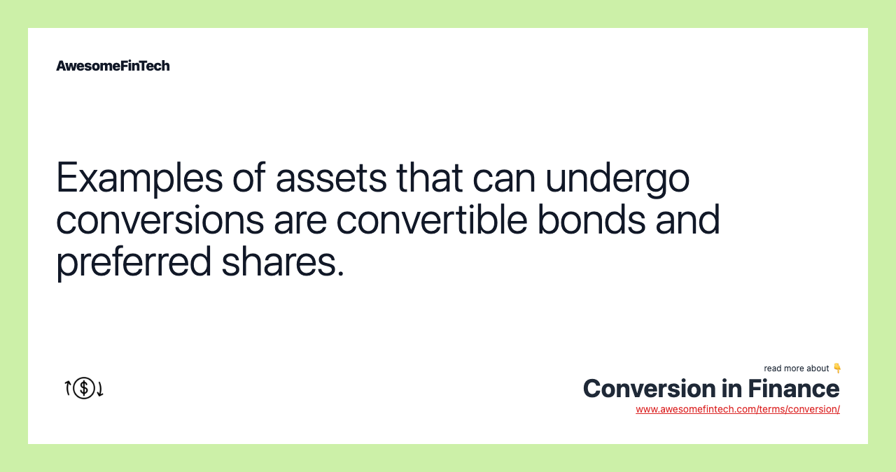 An example of an asset that can undergo conversion is a convertible bond. This type of bond gives the bondholder the option to exchange the bond for a predetermined amount of the bond issuer's equity. Typically, the bondholder will exercise the option when the total value of the shares received from conversion exceeds the bond's worth.