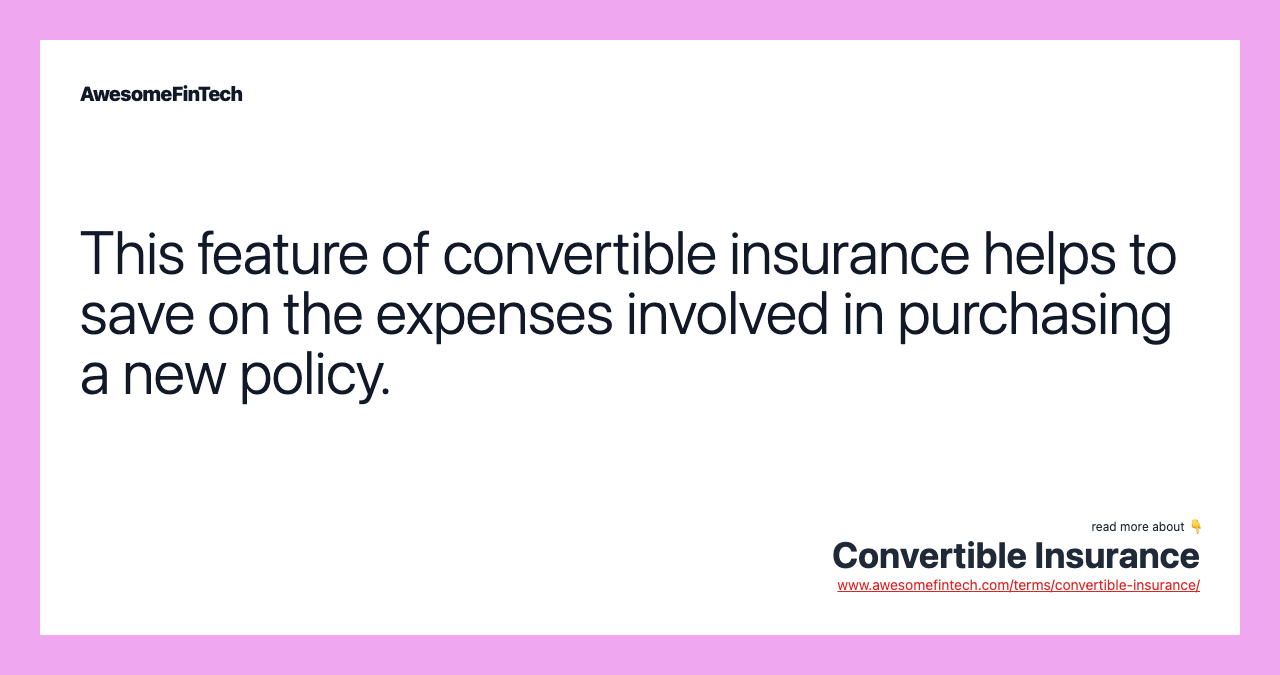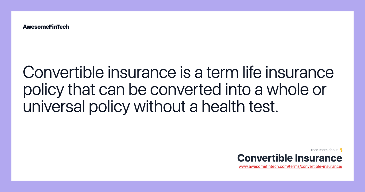 Convertible insurance is a type of life insurance that allows the policyholder to change a term policy into a whole or universal policy without going through the health qualification process again. Convertible insurance lets the insured convert a policy that only covers the policyholder’s beneficiaries for a predetermined number of years into a policy that covers the policyholder's beneficiaries indefinitely, as long as the policyholder continues to pay the insurance premium.
