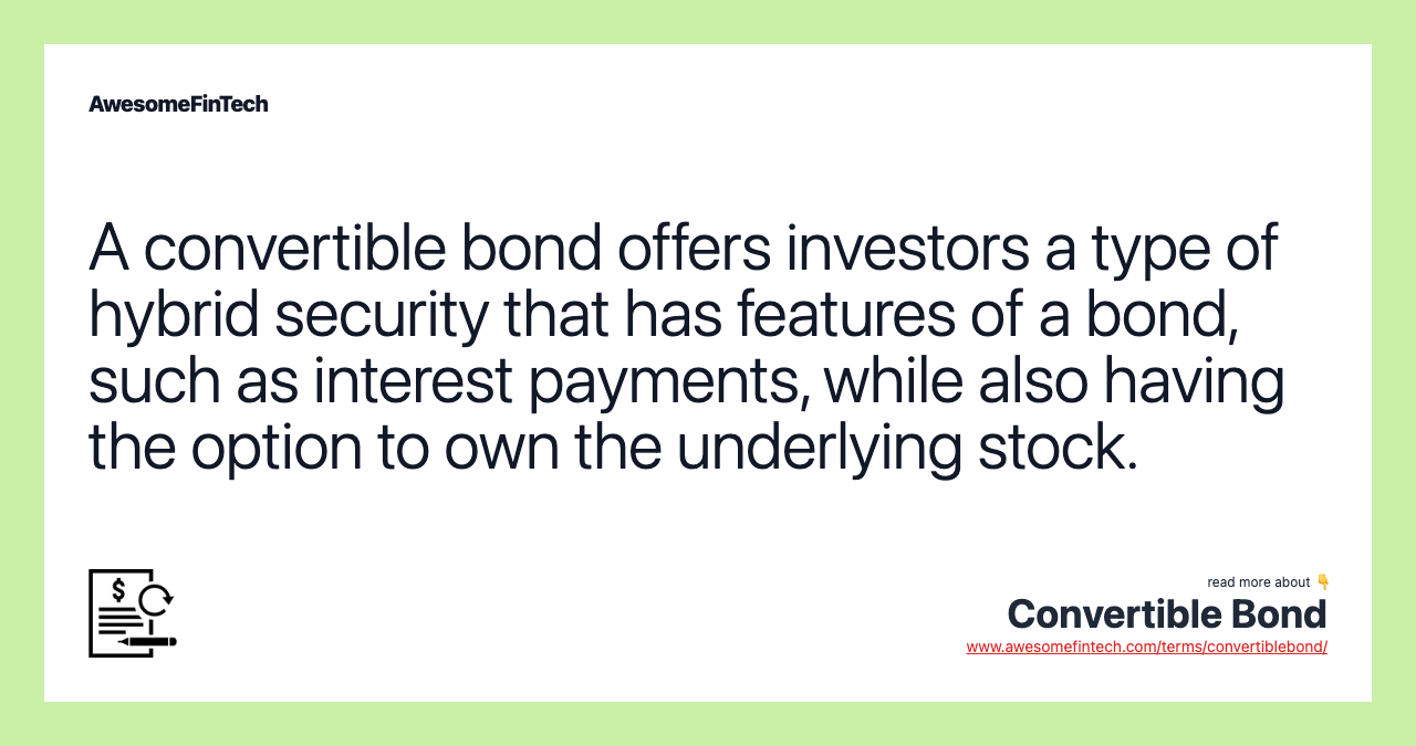 Table of Contents What Is a Convertible Bond? A convertible bond offers investors a type of hybrid security that has features of a bond, such as interest payments, while also having the option to own the underlying stock. Convertible bonds are a flexible financing option for companies. On the other hand, a reversible convertible bond gives the company the right to convert the bond to equity shares or keep the bond as a fixed income investment until maturity. Ideally, an investor wants to convert the bond to stock when the gain from the stock sale exceeds the face value of the bond plus the total amount of remaining interest payments. A convertible bond offers investors a type of hybrid security, which has features of a bond such as interest payments while also providing the opportunity of owning the stock.